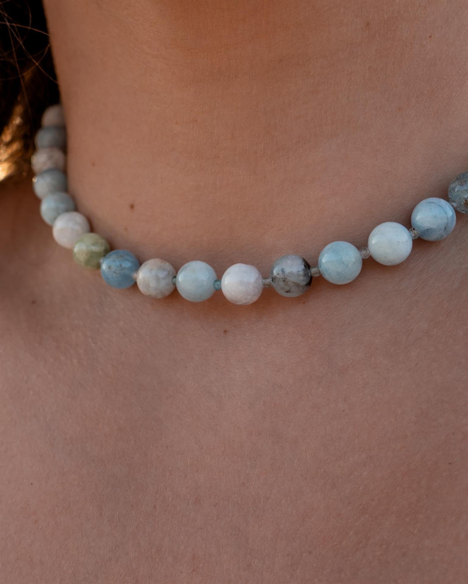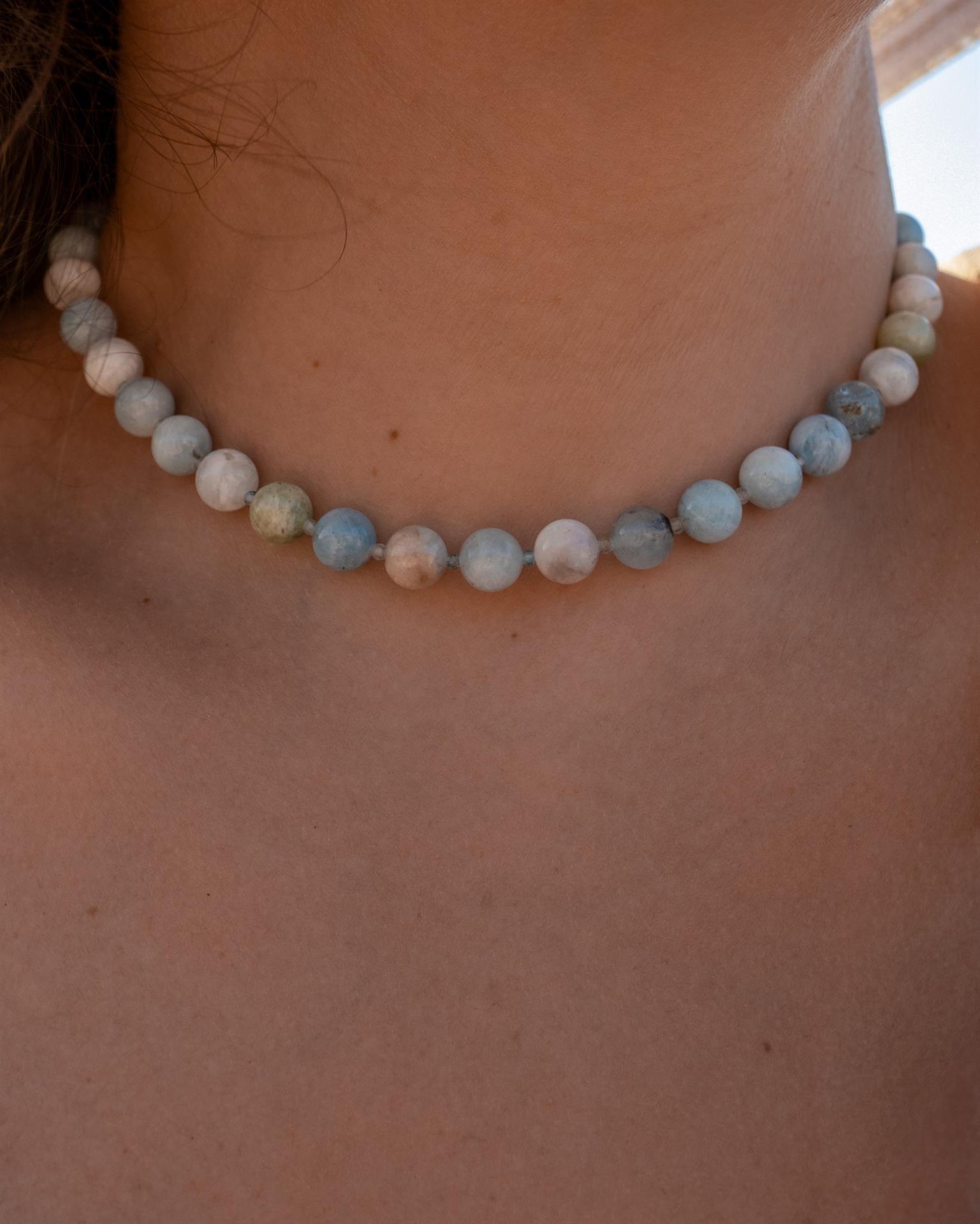 שרשרת צ'וקר עבודת יד מאבני 'אקוומרין' בשילוב חרוזי 'קוורץ'